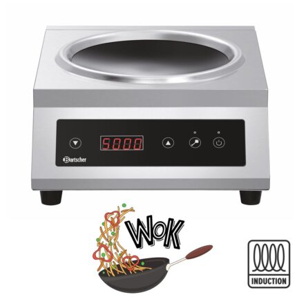 Επαγωγική εστία ηλεκτρονική WOK IW35-EB, Bartscher Γερμανίας. Το επαγωγικό γουόκ μπορεί να ενσωματωθεί σε πλάκες τραπεζιού και πλάκες εργασίας και προσφέρει έτσι ιδανικό ύψος εργασίας. Το ξεχωριστό πεδίο χειρισμού καθιστά δυνατή μια αδιαβάθμητη ρύθμιση από 60 έως 240 °C. Εναλλακτικά υπάρχουν 10 βαθμίδες απόδοσης προς επιλογή.