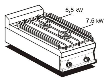 Διαστάσεις 1600x705x280(h)mm Ισχύς 44 KWatt , 37.840 Kcal/h 2 εστίες αερίου 2 x 7,5 KWatt + 4 x 5,5 KWatt + 2 x 3,5 KWatt Βάρος 130 kg Κωδικός Προϊόντος 182 116 50 8 ρυθμιζόμενοι διακόπτες