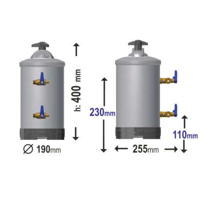 Διαστάσεις Ø190×500(h)mm Μαγειρικό αλάτι χονδρό ανά αναγέννηση 1.5 kg Πίεση νερού min 1 bar – max 8 bar Ρητίνη 8.4 lt Απόδοση 2520 lt Μέγιστη σκληρότητα 90°f Μέγιστη ροή νερού / h 1000 lt Αφαλατώνει 2520 lt νερού σε τιμές σκληρότητας: 20of, 11od, 200 ppm CaCo3