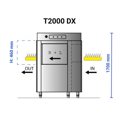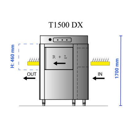 Διαστάσεις 1590x800x1700(h)mm Παραγωγή καλαθιών / hour 76-115 Ισχύς 24,52 ΚWatt, 400V / 3N / 50Hz Αντίσταση κάδου 8000 Watt Αντλία πλύσης 2 KWatt Αντλία απόπλυσης 0,37 Κwatt Xωρητικότητα κάδου πλύσης 70 lt Χωρητικότητα boiler 14 lt Φάσεις L – R (Πλύση – Απόπλυση) Πίεση νερού στην είσοδο 200 – 400 kPa Σκληρότητα νερού min 7 – max 12ºF Διπλά τοιχώματα Μονώμενα boiler Break tank Ενδείκνυται η τροφοδοσία με νερό θερμοκρασίας έως 55ºC
