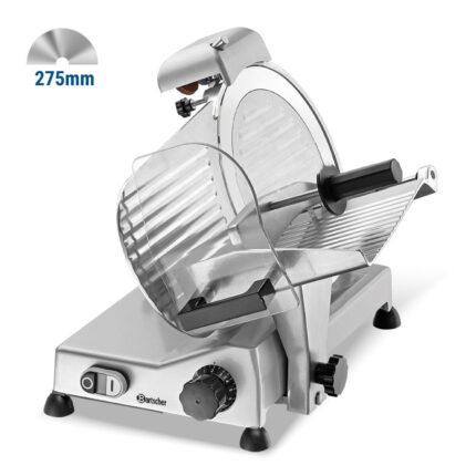 Ζαμπονομηχανή πλάγιας κοπής, Bartscher Γερμανίας. Ο εξοπλισμός της βελτιστοποιημένης μηχανής κοπής με λεπίδα 275 mm θα σας πείσει λόγω των τεχνικών χαρακτηριστικών από πολλές απόψεις. Η ισχυρή αυτή ζαμπονομηχανή πλάγιας κοπής διαθέτει βάση συγκράτησης των υπολειμμάτων, ακονιστήρι λεπίδων, οδηγό κοπής και, για εγγύηση της ασφάλειας, διπλή προστασία λεπίδων και μαγνητικό διακόπτη.