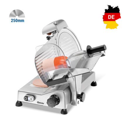 Ζαμπονομηχανή πλάγιας κοπής, Bartscher Γερμανίας. Ο εξοπλισμός της βελτιστοποιημένης μηχανής κοπής με λεπίδα 250 mm θα σας πείσει λόγω των τεχνικών χαρακτηριστικών από πολλές απόψεις. Αυτή η ισχυρή ζαμπονομηχανή πλάγιας κοπής διαθέτει βάση συγκράτησης των υπολειμμάτων, ακονιστήρι λεπίδων, οδηγό κοπής και, για εγγύηση της ασφάλειας, διπλή προστασία λεπίδων και μαγνητικό διακόπτη.