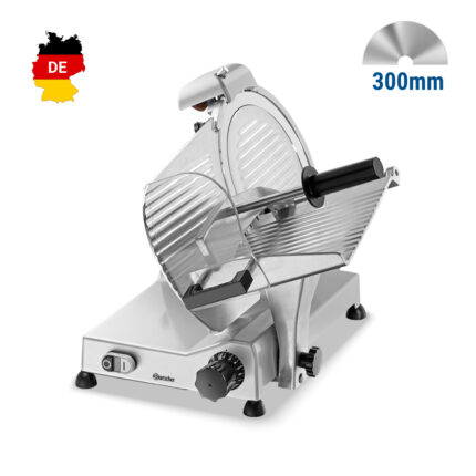 Ζαμπονομηχανή πλάγιας κοπής (Ø300 mm) , Bartscher Γερμανίας.  Ο εξοπλισμός της βελτιστοποιημένης μηχανής κοπής με λεπίδα 300 mm θα σας πείσει λόγω των τεχνικών χαρακτηριστικών από πολλές απόψεις. Το ισχυρό σύστημα κοπής υπό κλίση διαθέτει βάση συγκράτησης των υπολειμμάτων, ακονιστήρι λεπίδων, οδηγό κοπής και, για εγγύηση της ασφάλειας, διπλή προστασία λεπίδων και μαγνητικό διακόπτη.