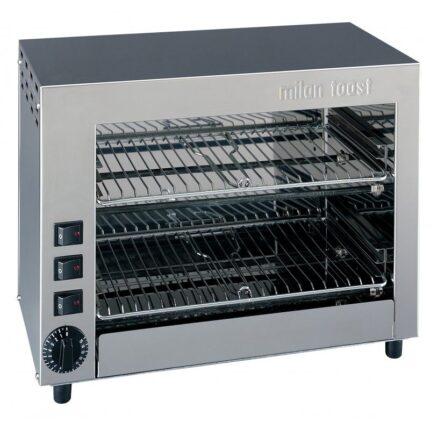 Διαστάσεις 220x410x370(h)mm Ισχύς 0,8 ΚWatt, 220-240V / 50-60Hz Μήκος αλυσίδας 14 cm Χωρητικότητα ταινίας 1 φέτα Παραγωγή/h 250 φέτες Μέγιστο ύψος φόρτωσης 4.2 cm Έξοδοι Μπροστά (standard), πίσω (με ειδικό kit) Κωδικός προϊόντος 18011 Ξεχωριστή ρύθμιση θερμοκρασίας πάνω & κάτω αντίστασης Επιλογέας για ρύθμιση λειτουργίας πάνω-κάτω ή μόνο κάτω Αποσπώμενο & πλενόμενο συρτάρι Ρυθμιζόμενη ταχύτητα «αλυσίδας» Αντιστάσεις QUARTZ για άμεσο ζέσταμα
